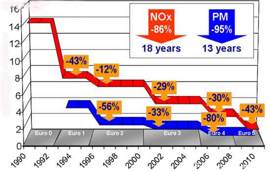 中國(guó)混凝土攪拌車(chē)汽車(chē)排放標(biāo)準(zhǔn)主要是參考?xì)W洲的標(biāo)準(zhǔn)。國(guó)三、國(guó)四排放標(biāo)準(zhǔn)污染物排放限值上與歐三、歐四標(biāo)準(zhǔn)完全相同,從上面的表格中我們可以看到,國(guó)四標(biāo)準(zhǔn)比國(guó)三對(duì)NOX和PM要求更為嚴(yán)格。